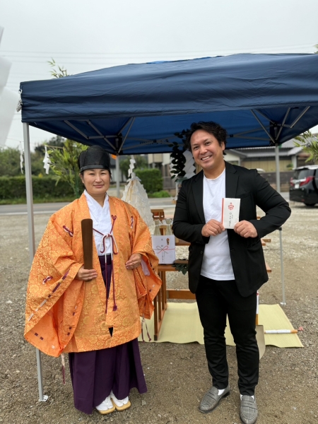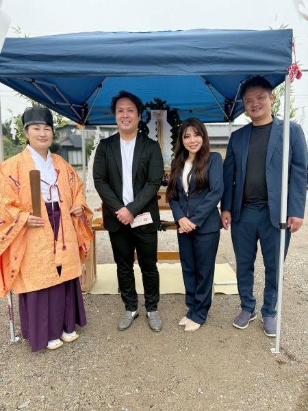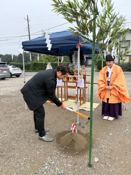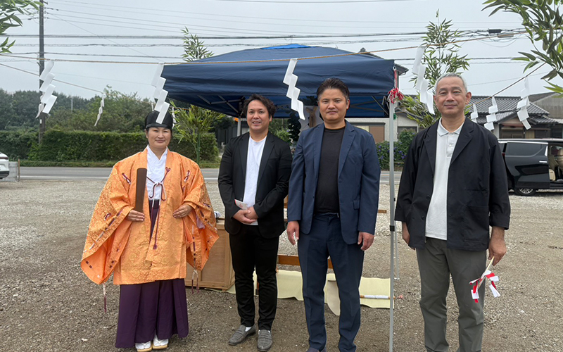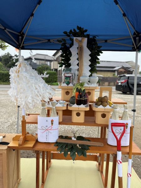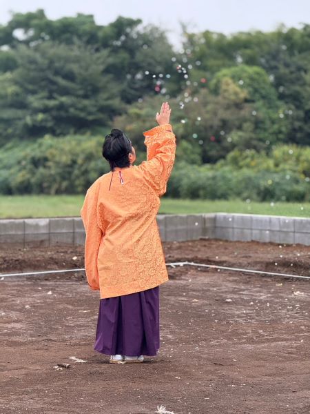 今回の地鎮祭では、珍しい女性の神主さんがご担当くださり、凛とした雰囲気の中にも柔らかさを感じる素敵な式となりました。